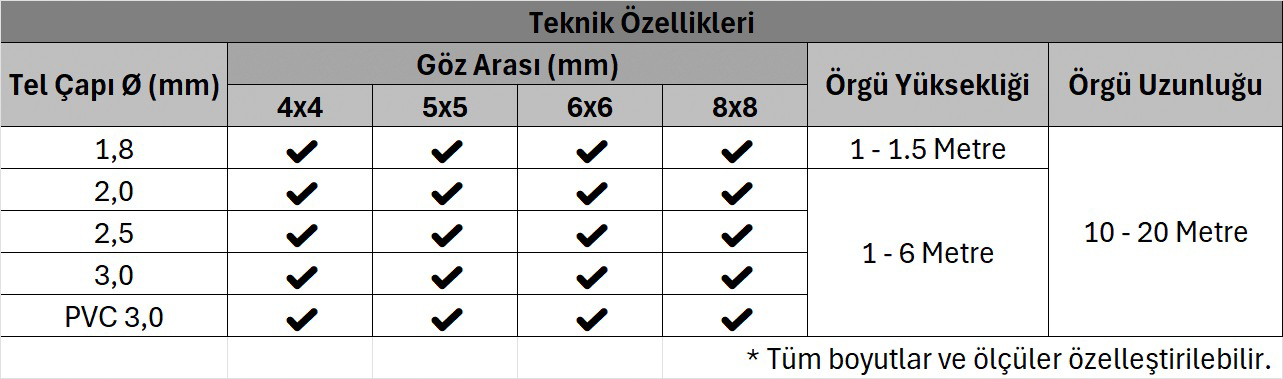 Manufactured from galvanized wire or galvanized wire coated with PVC, our products offer high resistance to external environmental conditions. They are also highly resistant to deformation. Even if a single point is damaged, the structure does not allow dismantling, ensuring long-lasting and reliable security for the applied area.The system is ready for use by stretching it between concrete, pipe, or angle iron posts. With various mesh sizes and wire thickness options, it is capable of meeting a wide range of needs and applications. kapasiteye sahiptir.