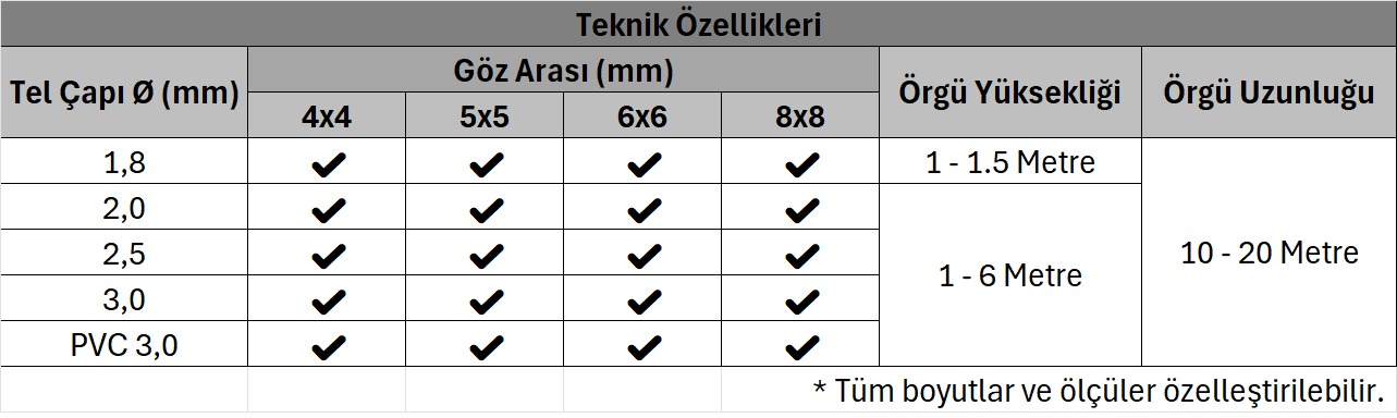 Galvanizli tellerden veya galvaniz tel üzeri PVC kaplama olarak üretildiklerinden, dış koşullara karşı dayanıklıdır. Deforme olmalara karşı da dayanıklıdır. Bir noktası hasar görse dahi sökülmeye meydan vermeyen bir yapıya sahiptir. Bu bağlamda uygulandığı alanın güvenliğini uzun süre ve sorunsuz olarak sağlamaktadır.Beton, boru veya köşebent direkler arasına çekilerek kullanıma hazır hale getirilir. Çeşitli göz aralıkları ve tel kalınlığı seçenekleriyle her türlü ihtiyaca cevap verilebilecek kapasiteye sahiptir.